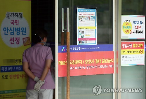 | △ 메르스 걱정 (인천=연합뉴스) 윤태현 기자 = 인천의 한 병원 간호사가 중동호흡기증후군(메르스) 의심 증세를 보여 질병관리본부의 검사가 진행되는 가운데 17일 오후 인천시 서구의 모 병원 입구에 메르스 의심환자·보호자의 출입을 금지하는 안내문이 붙어 있다. 2015.6.17 tomatoyoon@yna.co.kr |