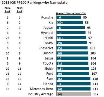 미국 최대 시장조사업체인 JD파워가 17일(현지시간) 발표한 2015년 신차품질조사(IQS)에서 기아차는 21개 일반브랜드 가운데 1위를, 현대차[005380]는 2위를 기록했다.