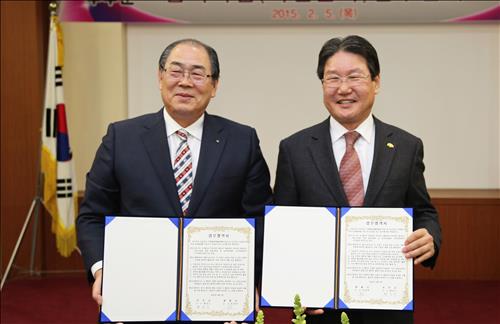 | △ 협력 다짐하는 박세복(오른쪽) 충북 영동군수와 황정수 전북 무주군수. |