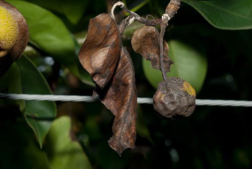 이 병에 걸린 과일나무의 잎은 흑갈색 병반으로 시들고, 줄기가 윗부분부터 마르기 시작해 아래쪽으로 퍼져 새순이나 가지가 검게 변해 말라 죽는 증상을 보인다.