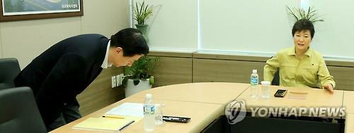 | △ (청주=연합뉴스) 백승렬 기자 = 박근혜 대통령이 17일 충북 청주시 흥덕구 오송읍 질병관리본부 국립보건연구원 방문, 송재훈 삼성서울병원장이 자리에 앉으며 고개 숙여 인사하고 있다. 2015.6.17 srbaek@yna.co.kr (끝) |