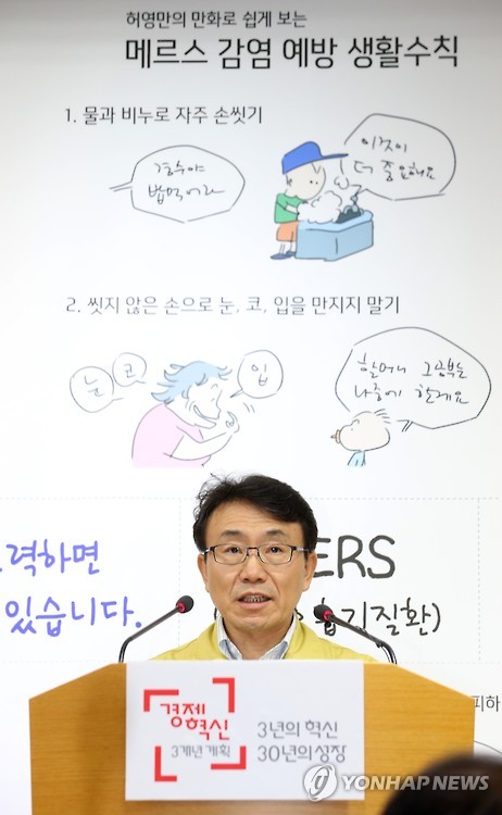 | △ 권덕철 총괄반장, '오늘은' (세종=연합뉴스) 배재만 기자 = 권덕철 중앙메르스관리대책본부 총괄반장이 18일 오전 정부세종청사 보건복지부 공용브리핑룸에서 열린 중동호흡기증후군(메르스) 정례 브리핑에서 메르스 현황에 대해 설명하고 있다. 2015.6.18 scoop@yna.co.kr http://blog.yonhapnews.co.kr/f6464 |