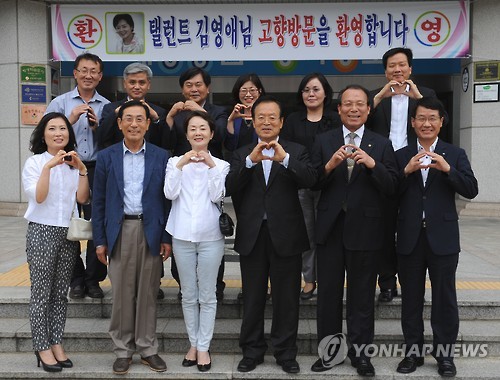 | △ 탤런트 김영애 고향 찾아 '아름다운 나눔' 약속 (부산=연합뉴스) 중견 여배우인 김영애(64)씨가 17일 고향인 부산 영도를 찾아 지역 인재양성을 위한 기부를 약속하고 구청장 등 구청 관계자와 기념사진을 찍고 있다. 2015.6.18 << 영도구 >> wink@yna.co.kr |