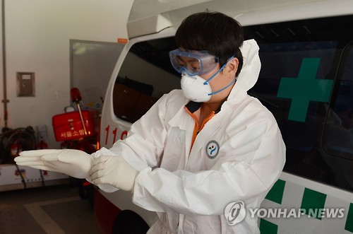 | △ 보호장비 착용하는 메르스 전담 구급대원 (서울=연합뉴스) 광진소방서 중동호흡기증후군(메르스) 전담 구급대원들이 18일 오후 메르스 의심환자 이송 신고를 받고 감염방지를 위해 보호의 및 보호장비를 착용하고 있다. 2015.6.18 << 광진소방서 제공 >> photo@yna.co.kr |