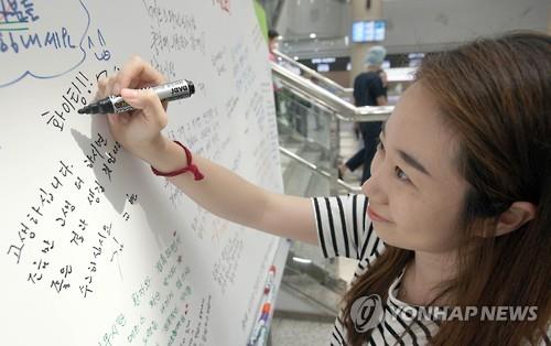 | △ 이 병원은 지난 16일 병원 1층 로비에 게시판을 설치하고 방문객들로부터 메르스 관련 응원 글을 받고 있다. <<연합뉴스 DB>> |