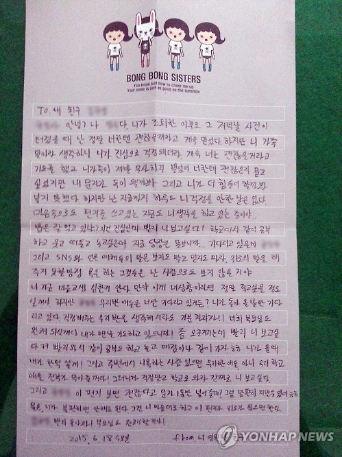 (대구=연합뉴스) 한무선 기자 = 중동호흡기증후군(메르스) 때문에 자가격리돼 등교하지 못하는 대구의 한 중학생에게 급우들이 단체로 손 편지를 보내 위로를 건넸다.