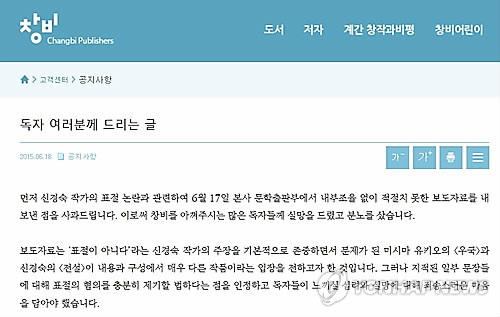 창비 측 관계자는 이날 홈페이지를 통해 공식 사과문을 게재한 뒤 연합뉴스와 통화에서 "(표절 부인 주장은) 철회한 것으로 보면 된다"며 "당사자인 신 작가와 논의를 통해 표절 시비를 포함해 건설적인 방향으로 논의를 이끌어나가는 노력을 적극적으로 기울일 것"이라고 말했다.