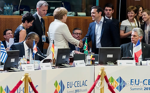 | △ 악수 나누는 獨·그리스 총리 (브뤼셀 AP=연합뉴스) 벨기에 브뤼셀에서 10일(현지시간) 개막한 유럽연합(EU)-라틴아메리카·카리브 국가공동체(CELAC) 정상회의에서 앙겔라 메르켈 독일 총리(가운데 왼쪽)와 알렉시스 치프라스 그리스 총리가 악수를 나누고 있다. 이날 그리스 구제금융 협상을 타결짓기 위해 앙겔라 총리와 치프라스 총리, 프랑수아 올랑드 프랑스 대통령 등의 3자 회동이 이곳에서 이루어질 것으로 알려졌다. marshal@yna.co.kr Greek Prime Minister Alexis Tsipras, center right, shakes hands with German Chancellor Angela Merkel, center left, at the start of a round table meeting at the EU-CELAC summit in Brussels on Wednesday, June 10, 2015. Greece's prime minister was hoping to meet with the leaders of Germany and France in Brussels Wednesday, in the latest effort to break a bailout negotiation deadlock that has revived fears his country could default and drop out of the euro. (AP Photo/Geert Vanden Wijngaert) |