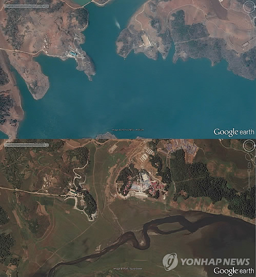 | △ 극심한 가뭄으로 북한 평안남도 개천시 연풍호가 메마른 모습이다. 구글어스 위성사진을 보면 연풍호의 2014년 4월 사진(위)은 물이 가득 차 있지만, 2014년 9월 사진(아래)은 가뭄으로 물이 말라버린 모습이 확인된다. (구글=연합뉴스 자료사진) |