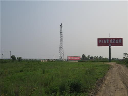 단둥 신도시 랑터우(浪頭)와 섬을 가르는 국경 제방과 철조망, 방치된 땅에 무성한 잡초 밖에 볼 수 없다.