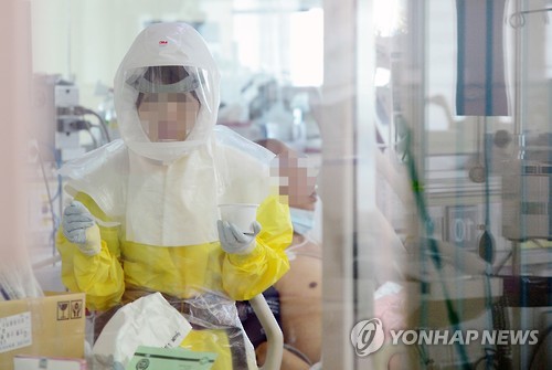 | △ '메르스 환자, 꼭 치료하겠습니다' (서울=연합뉴스) 윤동진 기자 = 19일 오전 메르스 환자가 격리 치료 중인 서울 중구 국립중앙의료원에서 방호복을 입은 한 간호사가 업무를 보고 있다. |