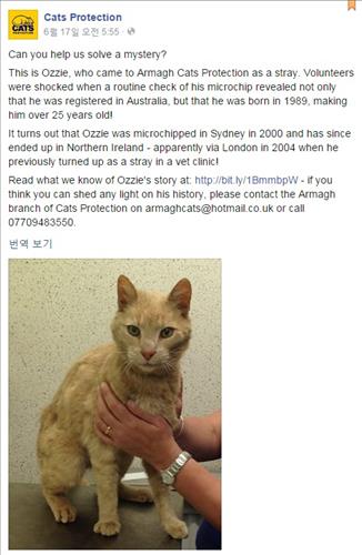 25세 호주 고양이, 1만7천㎞ 떨어진 북아일랜드서 발견