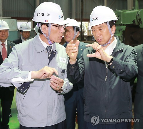 | △ 울산 기업체 현장 찾은 김기현 울산시장 (울산=연합뉴스) 김기현 울산시장(오른쪽)은 4일 울산 미포공단에 있는 ㈜유벡을 찾아 지역 석유화학플랜트업체 대표들과 경제활성화에 대한 다양한 의견을 교환한 뒤 공장을 둘러봤다.2015.6.4 << 울산시 >> young@yna.co.kr |