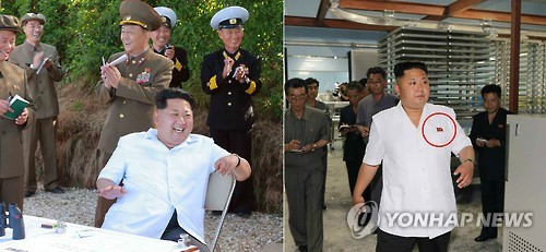 | △ 김일성·김정일 배지 가슴에서 뗀 김정은 (서울=연합뉴스) 김정은 북한 국방위원회 제1위원장이 최근 '김일성·김정일 배지'를 가슴에 달지 않고 공개석상에 등장하는 모습이 이달 들어 수차례 확인되고 있다. 할아버지와 아버지의 후광에 기대왔던 그가 '홀로서기'를 예고하는 것이 아니냐는 추측도 나온다. 지난해 6월 29일 수산물 가공공장을 시찰할 당시(오른쪽)에는 배지를 달고 있던 김정은 제1위원장이 함대함 미사일 훈련을 참관한 이달 15일(왼쪽)에는 같은 옷을 입고도 배지를 달지 않고 등장했다. 2015.6.21 nkphoto@yna.co.kr |