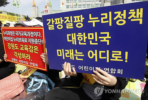 민 교육감은 올해 도내 어린이집 누리과정 총 예산 666억원 가운데 1∼3월분 176억원만을 편성했고, 지난 4월부터 어린이집 운영비 지원 중단 사태가 일어나면서 어린이집 원장 등의 거센 항의에 시달렸다.