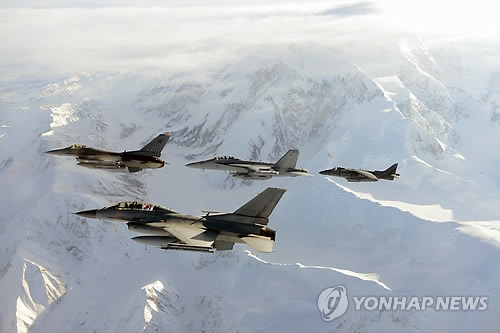 | △ 공군, 레드플래그 알래스카 훈련 본격 돌입 (서울=연합뉴스) 3일(현지시간) 미국 알래스카에서 열린 레드플래그 알래스카 훈련에서 현지 적응에 나선 전투기들이 친숙화 비행을 하고 있다. 눈으로 뒤덮인 알래스카의 상공에서 우리 공군의 KF-16(맨 앞)의 조종사가 태극기를 펼쳐 보이고 있다. 그 뒤로는 왼쪽부터 미공군의 F-16CM, EA-18G 그라울러, AV-8B 해리어가 나란히 비행하고 있다. 레드플래그 알래스카 훈련은 미국 태평양공군사령부가 주관하는 다국적 연합.합동 전술 공중전투훈련으로 연 3회 시행된다. 2014.10.6 << 공군 >> photo@yna.co.kr |