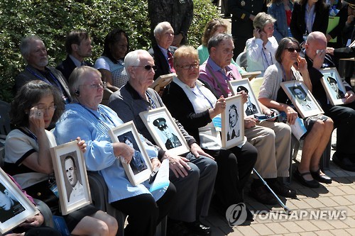 | △ 6·25 미군 실종자 유족 60여년만에 임진각서 추모행사 (파주=연합뉴스) 지난달 20일 오전 경기도 파주 임진각 평화누리공원 내 미군 참전기념비에서 6·25 전쟁에 참전해 실종됐으나 아직 유해도 찾지 못한 미군 장병의 가족 49명과 박승춘 국가보훈처장 등 보훈 단체장들이 참석한 가운데 ‘자유를 위한 희생, 영원히 기억하겠습니다’ 라는 주제로 6·25참전 미군 실종장병 추모식이 열렸다. <<자료사진>> |