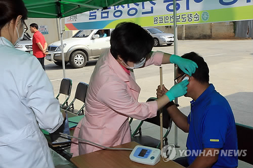 | △ 중동호흡기증후군(메르스) 환자 발생으로 14일동안 마을이 통째로 격리됐다가 19일 풀려난 전북 순창군 장덕마을에서 순창군보건의료원 직원들이 주민을 상대로 발열 여부 등을 체크하고 있다. (연합뉴스 자료사진) |