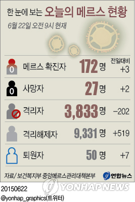 (서울=연합뉴스) 고미혜 기자 = 국내 중동호흡기증후군(메르스) 환자가 3명 추가 확인돼 172명으로 늘었다. 기존 확진자 중에서 2명이 숨져 전체 사망자는 27명으로 집계됐다.