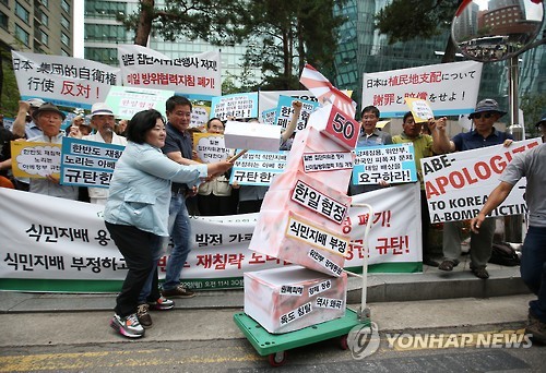 그러면서 이날 저녁 열리는 한일수교 50주년 기념식을 의식한 듯 아베 신조 일본 총리의 사진이 붙은 케이크상자 모형을 망치로 부수는 퍼포먼스도 벌였다.