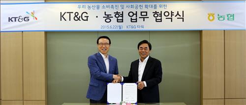 (서울=연합뉴스) 인교준 기자 = KT&G는 22일 오전 강남구 대치동 소재 KT&G 서울사옥에서 농협중앙회와 '우리 농산물 소비촉진과 사회공헌 확대를 위한 업무 협약'을 체결했다고 밝혔다.
