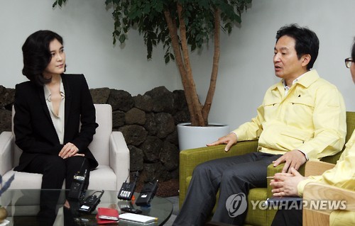 | △ (제주=연합뉴스) 전지혜 기자 = 22일 오후 제주도청 지사 집무실에서 원희룡(오른쪽) 제주지사와 이부진 호텔신라 사장이 중동호흡기증후군(메르스) 대책을 논의하고 있다. 호텔신라는 메르스 141번 환자가 확진 판정 전 여행하며 제주 서귀포시 중문관광단지의 신라호텔에서 묵은 사실이 확인되자 호텔 영업정지를 결정했다. 2015.6.22 atoz@yna.co.kr |