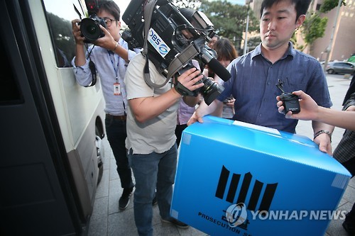 | △ 검찰, 산업은행 본점 압수수색 (서울=연합뉴스) 박지호 기자 = 포스코의 성진지오텍 지분 고가 매수 의혹과 관련해 산업은행에 대한 압수수색에 나선 서울중앙지검 특수2부 관계자들이 3일 오후 서울 여의도 산업은행 본점에서 관련 증거물이 들어있는 박스를 들고 나오고 있다. 2015.6.3 jihopark@yna.co.kr |