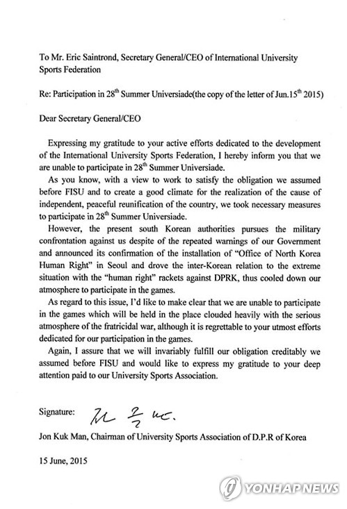 | △ 북한이 보낸 광주하계유니버시아드 대회 불참 메일 |