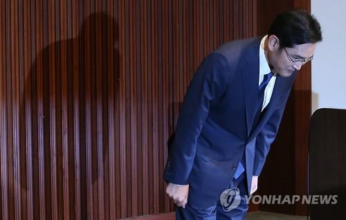 회견이 예정된 오전 11시 정각 이 부회장은 서초사옥 다목적홀에 모습을 드러냈다. 짙은색 정장에 푸른색 계열의 넥타이를 맨 이 부회장은 다소 긴장된 표정으로 자신을 둘러싼 카메라를 통해 국민 앞에 머리를 숙였다.