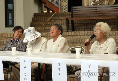 | △ 기자회견 하는 위안부 피해 할머니 (광주=연합뉴스) 류수현 기자 = 경기도 광주시 퇴촌면 위안부 피해자 쉼터인 나눔의 집에서 위안부 피해 할머니들이 미국 법원에 손해배상 소송을 제기하게 된 배경 등을 밝히는 기자회견을 연 가운데 피해자 중 한 분인 이옥선 할머니(맨 오른쪽)가 발언하고 있다. 맨 왼쪽부터 강일출, 유희남, 박옥선 위안부 피해 할머니. |