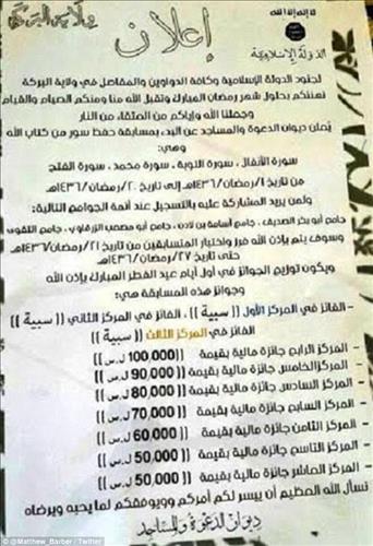 22일(현지시간) 영국 일간 데일리메일에 따르면 이슬람 모스크 사무처는 시리아에서 활동하는 IS 전사들을 겨냥해 27일까지 7일간 코란 암기 대회를 한다는 공고를 냈다. 이 공고의 사진은 트위터에 올려졌다.