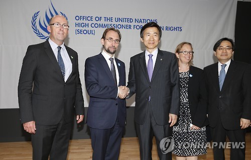 | △ '유엔 북한인권사무소' 개소식 (서울 사진공동취재단=연합뉴스) 북한의 인권 상황을 감시하는'유엔 북한인권사무소'(서울 유엔인권사무소) 개소식이 23일 오후 서울 종로구 글로벌센터에서 열려 참석자들이 기념촬영을 하고 있다. 왼쪽부터 로리 문거븐 유엔인권최고대표사무소 아시아 태평양 국장, 자이드 라아드 알 후세인 유엔 인권최고대표, 윤병세 외교부장관, 사인 폴슨 초대소장. |