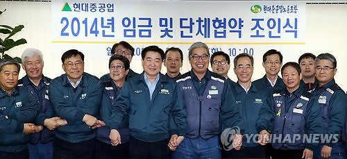 | △ 현대중공업은 복수노조인 사무직 노조가 요청할 경우 임단협 교섭을 벌일 계획이라고 밝혔다. 사진은 지난 2월 울산 본사에서 열린 임단협 타결 조인식 모습. (연합뉴스 자료사진) |