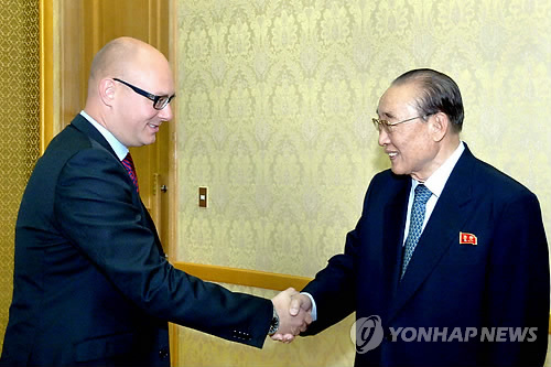 | △ 지난 2012년 7월 북한 양형섭 최고인민회의 상임위원회 부위원장이 평양 만수대의사당에서 스웨덴 국회의원대표단 단장인 유한 리난데르 국회법무위원회 부위원장과 악수하고 있다. 2015.6.24.<<연합뉴스DB>> |