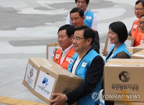 | △ 네팔로 보내는 구호물품 (부산=연합뉴스) 유엔평화기념관은 세계난민의 날인 20일 오후 부산 유엔평화기념관 공존의 광장에서 김정훈 국회의원 등이 지진피해로 고통을 겪는 네팔 국민에게 전달할 구호물품을 싣고 있다. 2015.6.20 << 유엔평화기념관 >> |