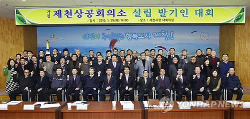 | △ 제천단양상공회의소 추진협의회는 24일 제천시청에서 창립총회를 열어 정관, 회원관련 규정, 사업계획 등을 심의.의결했다. 사진은 지난 1월에 열린 제천상의 발기인대회 모습.(연합뉴스 자료사진) |