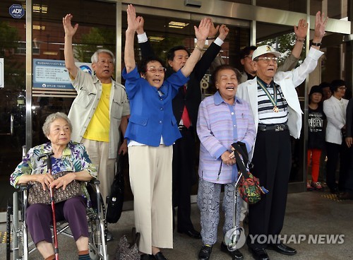 | △ 근로정신대 항소심도 이겼다 (광주=연합뉴스) 박철홍 기자 = 24일 오후 광주고등법원에서 근로정신대 할머니와 시민단체 회원들이 미쓰비시 중공업을 상대로 낸 손해배상 소송 항소심에서 승소한 후 만세를 외치며 기뻐하고 있다. 2015.6.24 pch80@yna.co.kr |