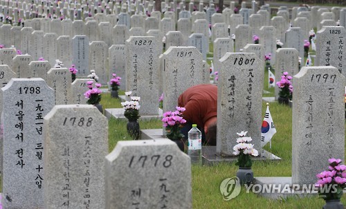 | △ '세월이 흘러도' (서울=연합뉴스) 서명곤 기자 = 6·25 전쟁 65주년을 하루 앞둔 24일 오후 서울 동작구 서울현충원을 찾은 신상철씨가 1950년 7월 문경지구에서 전사한 작은아버지 고(故)신현홍 중령의 묘비 앞에서 절을 하고 있다. |