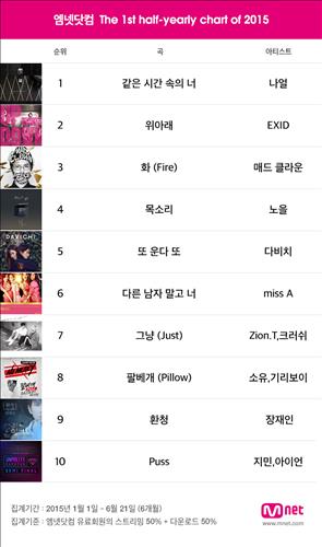 엠넷닷컴은 2015년 상반기(1월 1일~6월 21일) 음원 판매량(스트리밍+다운로드)을 집계한 결과 '같은 시간 속의 너'가 종합차트 1위를 차지했다고 25일 밝혔다.