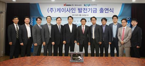 | △ 한헌수 총장(왼쪽부터 6번째), 신요안 산학협력단장(왼쪽부터 4번째), 이정현 교수(왼쪽부터 5번째), 최승락 AllThatSoft 대표(왼쪽부터 7번째) 등이 참석한 가운데 24일 숭실대에서 기술이전 협약식(케이사인 발전기금 출연식)이 열렸다. <<숭실대 제공>> |