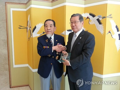 | △ 주일대사관저서 재일학도병 초청행사 (도쿄=연합뉴스) 조준형 특파원 = 6·25 전쟁 발발 65주년인 25일 일본 도쿄 미나토(港)구의 주일 대사 관저에서 재일학도 의용군 참전자 초청 행사가 열렸다. 참전 용사인 이봉남(96) 옹(왼쪽)이 유흥수 주일대사로부터 감사패를 받은 뒤 악수하는 모습이다. 2015.6.25 jhcho@yna.co.kr |