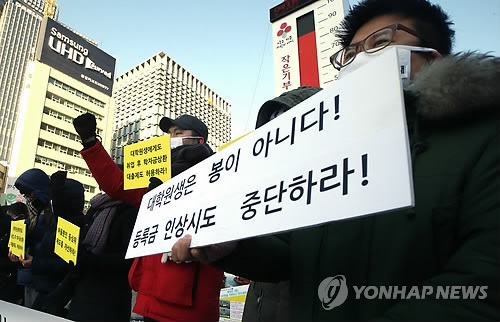 | △ 전국대학원총학생회협의회 소속 대학원생들이 지난 1월 서울 광화문광장에서 '대학원 등록금 인상 전가 중단 및 교육비 경감 촉구' 기자회견을 열고 있다. (연합뉴스 자료사진) |