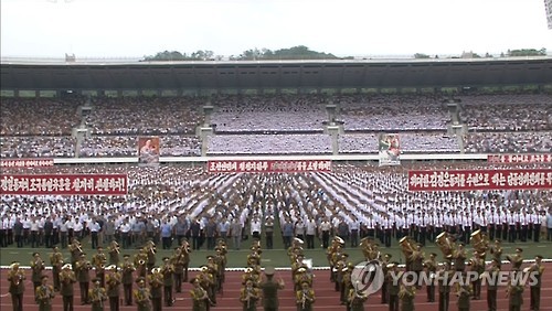 | △ 북한, 6·25 맞아 '반미 투쟁' 선동 (서울=연합뉴스) 북한은 6·25 전쟁 65주년인 25일 평양 김일성경기장에서 대규모 군중대회를 개최해 '반미 투쟁'을 선동하고 자위적 핵 무력을 강화하겠다는 방침을 천명했다. 조선중앙TV는 이 군중대회를 녹화실황중계했다. 2015.6.25 nkphoto@yna.co.kr |