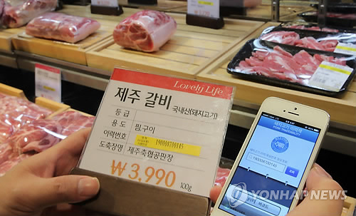 | △ 서울의 한 축산매장에서 한 직원이 돼지고기의 이력정보를 확인하고 있다. (연합뉴스 자료사진) |