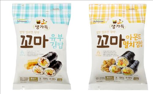 '꼬마 유부김밥(150g·3인분)'에는 가다랑어포로 맛을 낸 유부피와 당근, 단무지를 넣었으며 '꼬마 아몬드멸치김밥'(124g·3인분)에는 국내산 멸치와 해바라기씨, 캐슈넛, 호두, 아몬드 등 4가지 견과류를 넣은 아몬드멸치볶음이 들어있다.