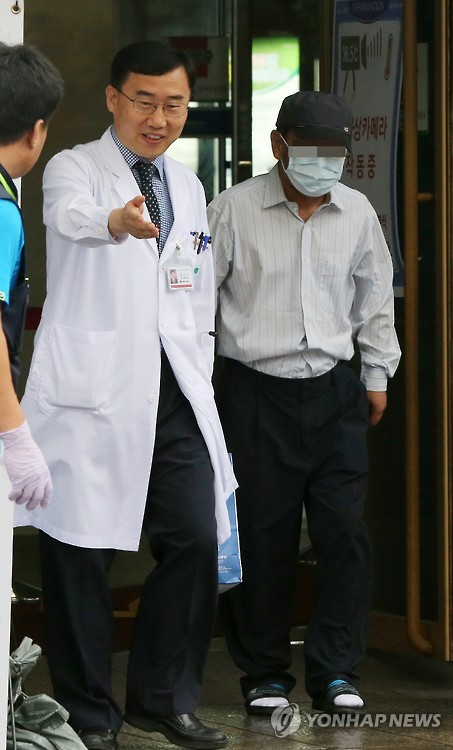 | △ 일상으로 돌아가는 메르스 환자 (대구=연합뉴스) 김준범 기자 = 26일 오전 중동호흡기증후군(메르스) 완치 판정을 받은 A(52)씨가 담당 의사인 김신우 감염내과 교수의 안내를 받으며 대구시 중구 삼덕동 경북대학교병원에서 퇴원하고 있다. 2015.6.26 psykims@yna.co.kr |