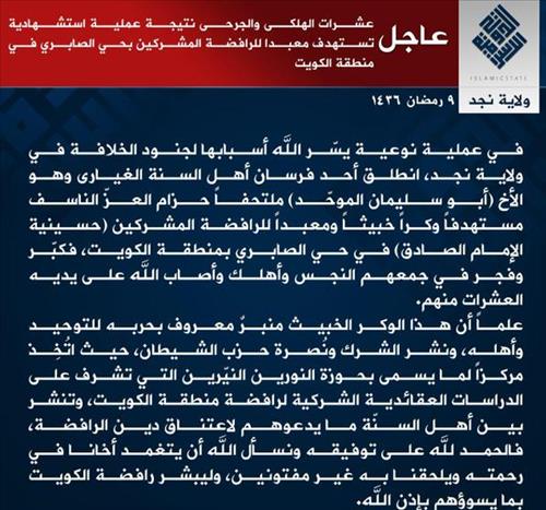 | △ IS가 26일 쿠웨이트 시아파 모스크를 공격했다고 주장한 성명 |