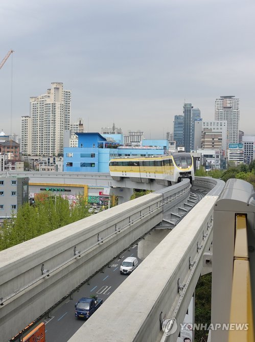 | △ 달리는 대구 3호선 (대구=연합뉴스) 김선형 기자 = 18일 오후 대구 수성구민운동장역에 도시철도 3호선 모노레일이 들어서고 있다. 2015.4.18 sunhyung@yna.co.kr |