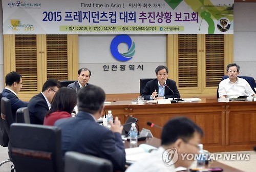 | △ 인천시 프레지던츠컵 추진상황 보고회 (인천=연합뉴스) 17일 인천시청에서 유정복 시장 주재로 '2015 프레지던츠컵' 골프대회 추진상황 보고회가 열리고 있다. 프레지던츠컵 대회는 오는 10월 6∼11일 인천 송도국제도시 잭니클라우스 골프클럽에서 열린다. 2015.6.17 <<인천시>> inyon@yna.co.kr |