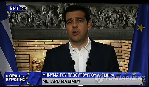 | △ (아테네 AP=연합뉴스) 알렉시스 치프라스 그리스 총리가 27일(현지시간) 아테네에서 TV로 생중계된 긴급 연설을 통해 국제채권단이 제시한 구제금융 방안을 다음달 5일 국민투표에 부치겠다고 발표하고 있다. marshal@yna.co.kr |